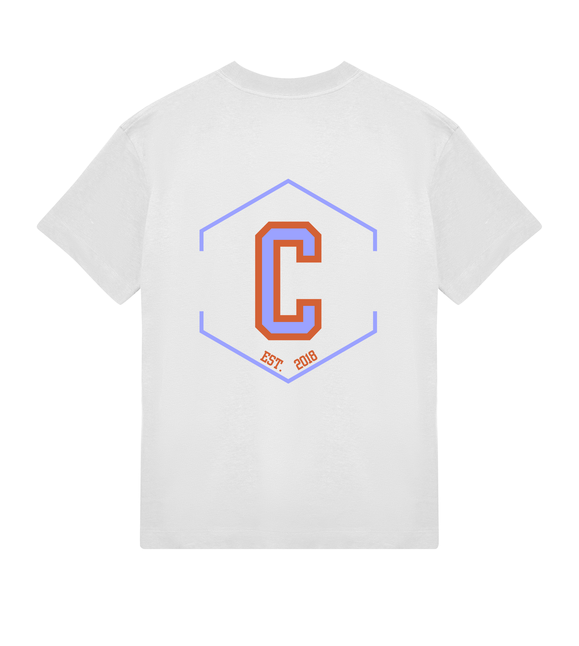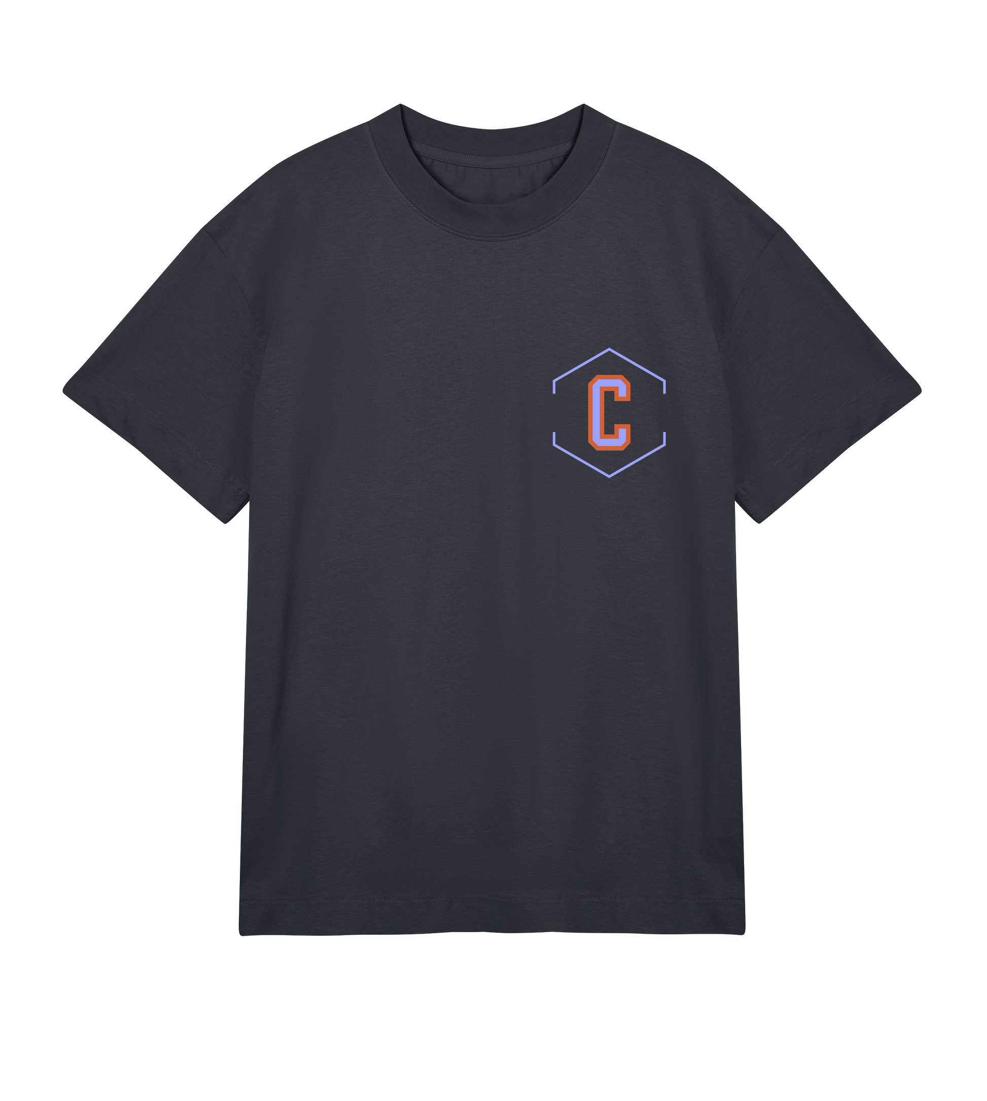 A Mens Boxy Tee in heavy 100% organic cotton, single jersey with oversized, boxy cut and a high, chunky crewneck rib for enhanced shape. The garment features single needle stitching at the sleeve opening and also at the elongated hem fold. Additional detailing includes felled shoulder seams with neck tape, and single chain/straddle stitching over the seam.