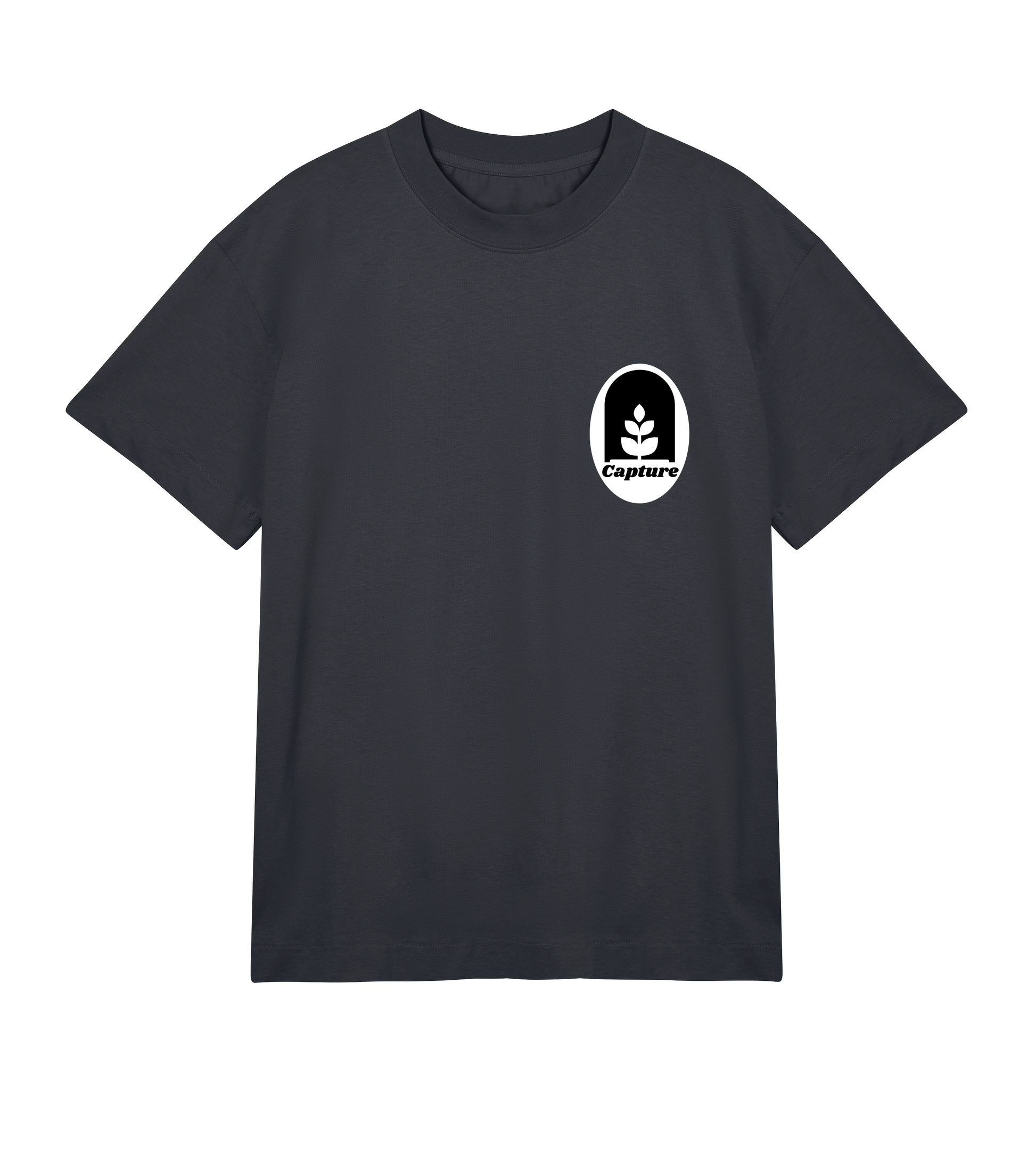 A Mens Boxy Tee in heavy 100% organic cotton, single jersey with oversized, boxy cut and a high, chunky crewneck rib for enhanced shape. The garment features single needle stitching at the sleeve opening and also at the elongated hem fold. Additional detailing includes felled shoulder seams with neck tape, and single chain/straddle stitching over the seam.